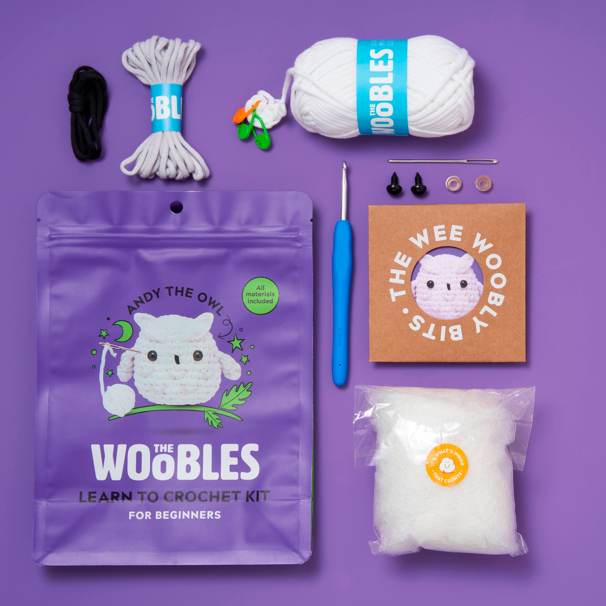 - 1 Andy the Owl Beginner+ Kit with crochet hook