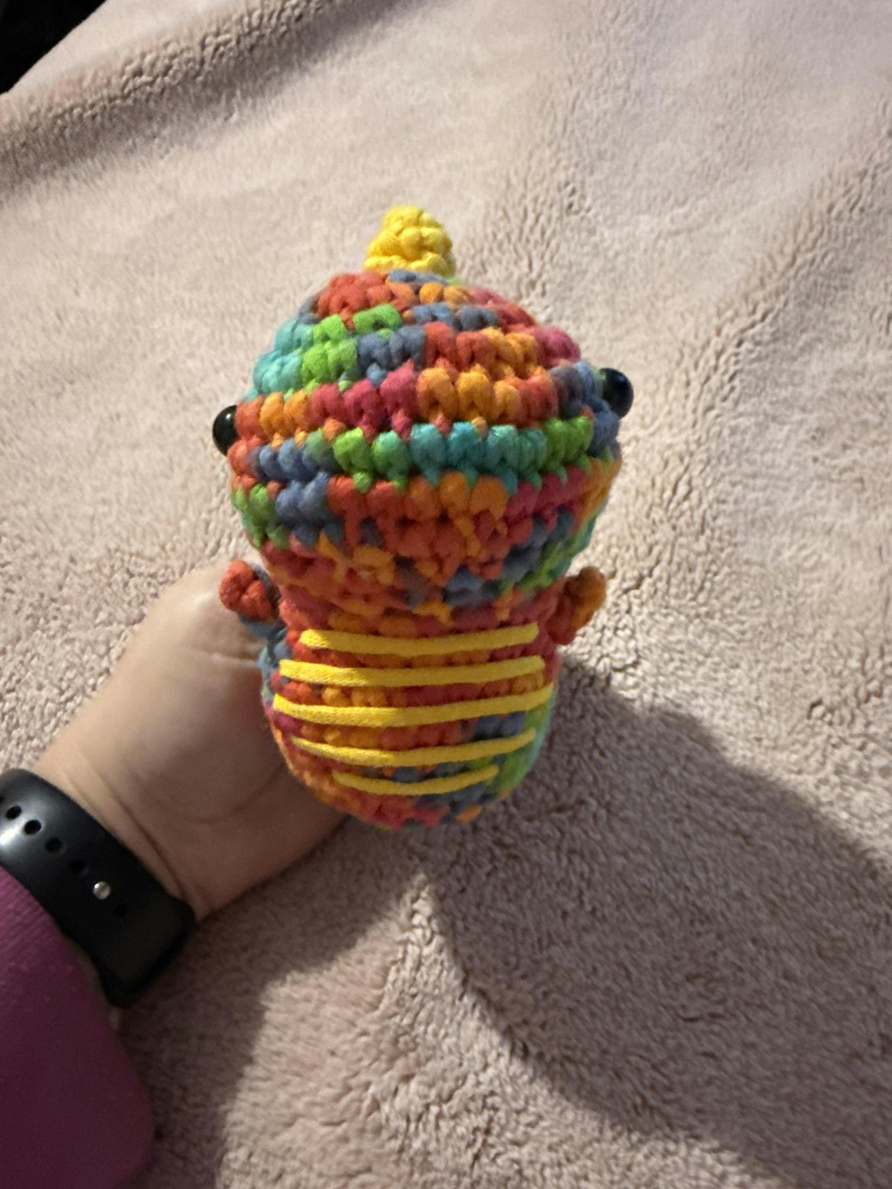 Because of Disco Fred's groovy multicolored yarn, first time crocheters may want to start with another Woobles beginner kit first. Already done a Woobles kit? Then go ahead and boogie the night away with Disco Fred.